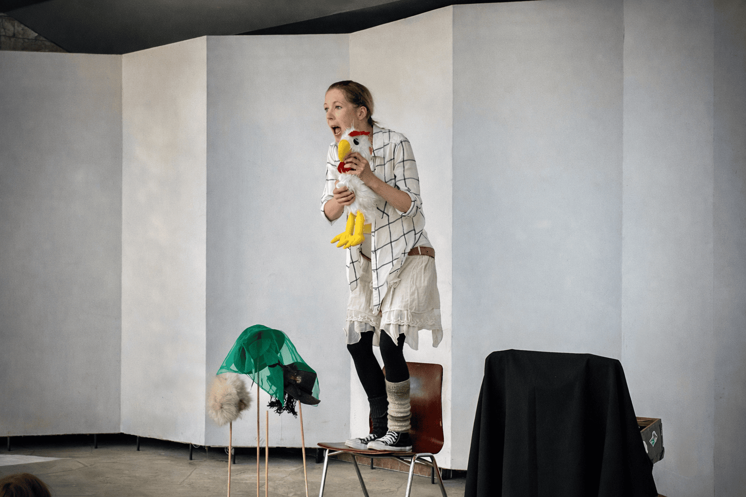 Julia Debusson, Schauspielerin des Langenargener Festspielensembles, liest das Märchen dem Publikum vor und stellt Teile der Geschichte, Figuren und Handlungen lebendig und bildhaft dar.
